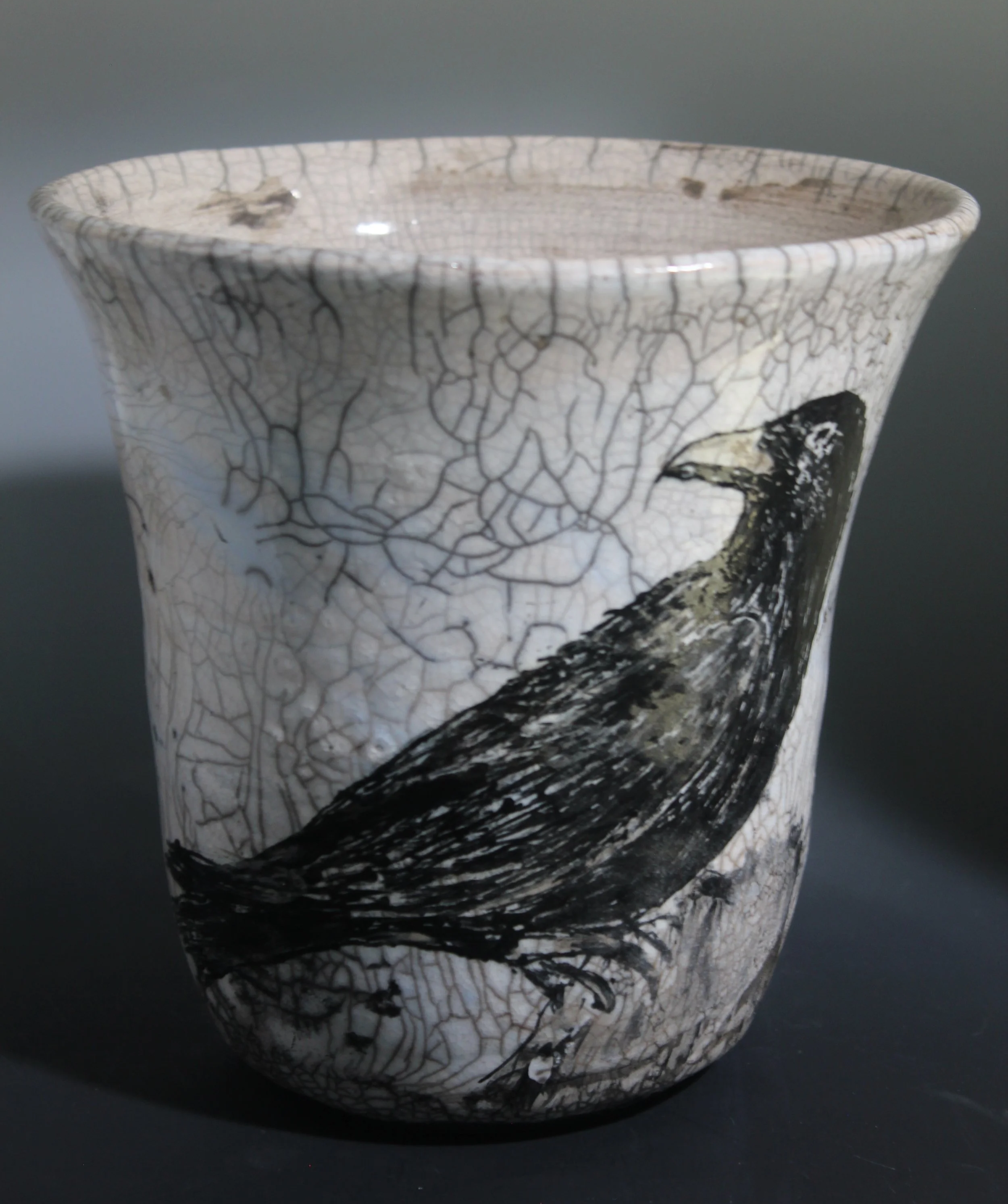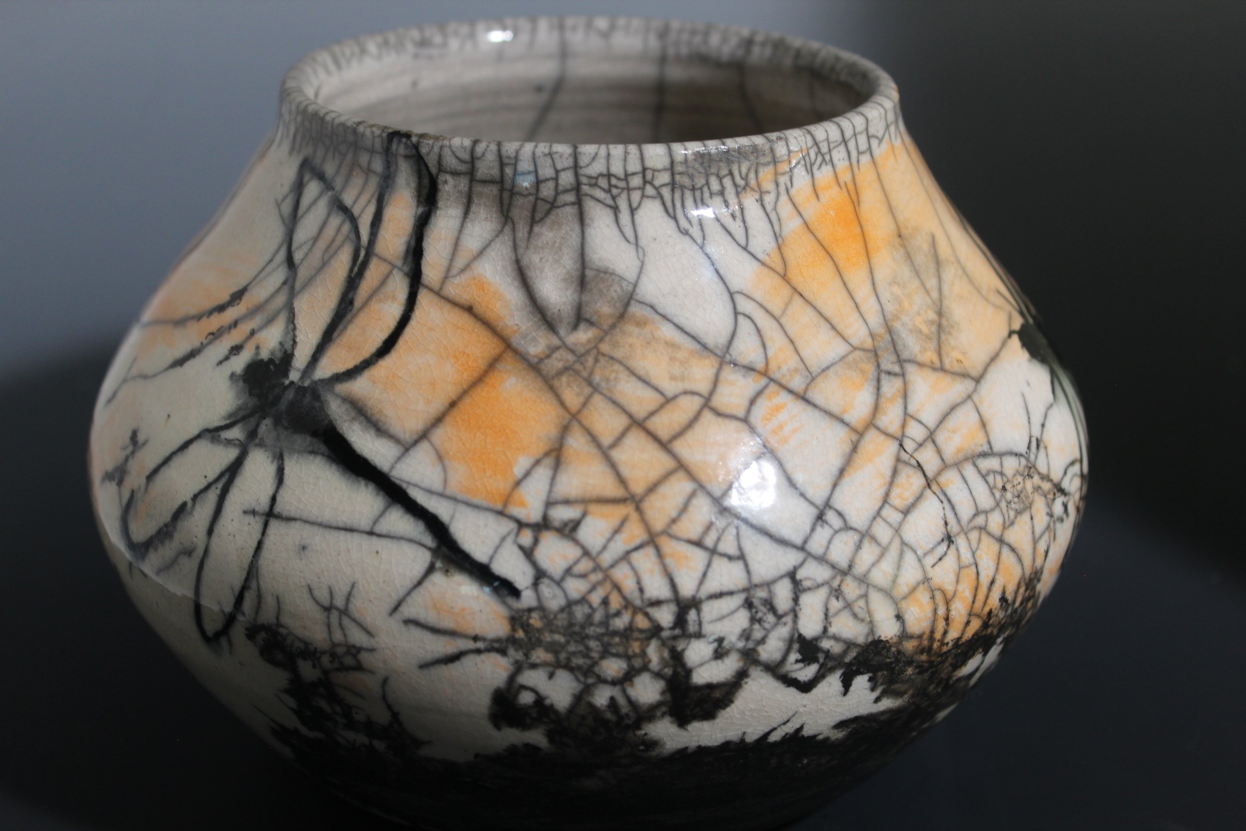 Videos of Raku firing: Creating the crackle and Removing pots from Smoking Can, The background is created by layering customer colored slip over the freshly wheel thrown pot. After bisque firing the Black and White line drawing is added before the Raku firing. The Raku firing creates a web of cracks which are highlighted with smoke from the Raku process.