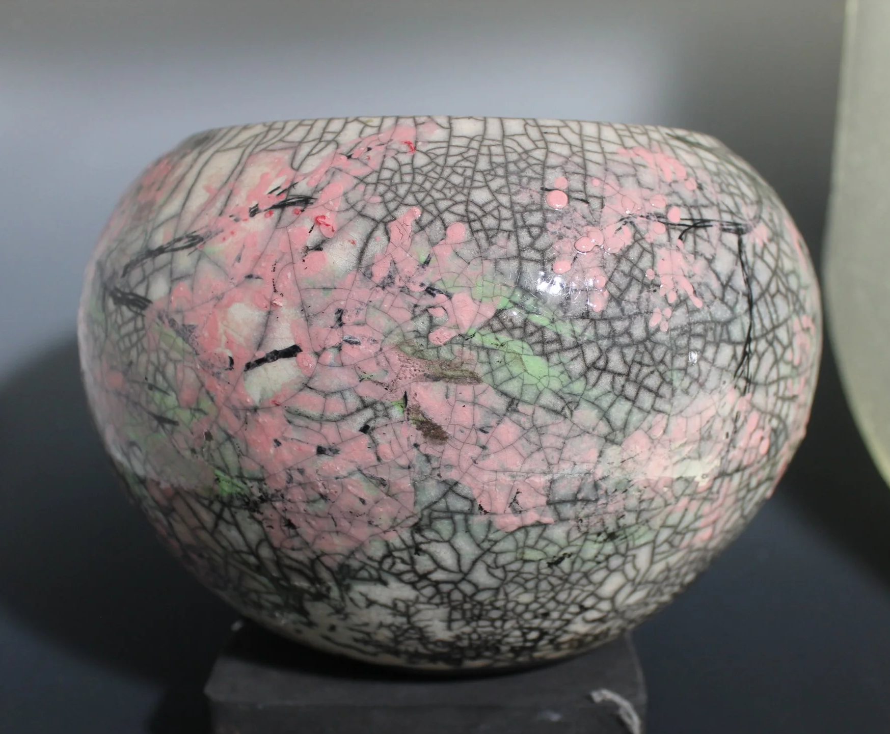 Electric Storm . Horse Hair Raku #5 - Burnished Pink and white base layer applied before firing. Jagged lines are created when course hair touches a 1700F and shrivels. Speckles are created using grains of sugar. Approximately 6.5 inches wide and 5.5 inches tall. $150